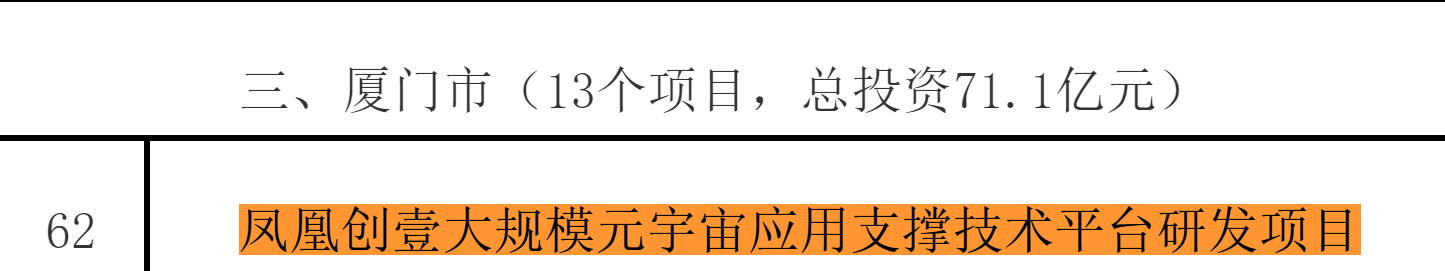近日,根據(jù)省政府工作部署,為深入開展習(xí)近平新時代中國特色社會主義思想主題教育,持續(xù)拓展“深學(xué)爭優(yōu)、敢為爭先、實(shí)干爭效”行動,更大發(fā)揮數(shù)字經(jīng)濟(jì)重點(diǎn)項目支撐帶動作用,進(jìn)一步做大做強(qiáng)做優(yōu)數(shù)字經(jīng)濟(jì),經(jīng)部門地方推薦,省數(shù)字辦遴選確定2023年度省數(shù)字經(jīng)濟(jì)重點(diǎn)項目191個,項目總投資1168億元,年度計劃投資260億元。這是我省首次遴選確定年度數(shù)字經(jīng)濟(jì)重點(diǎn)項目。廈門市有鳳凰創(chuàng)壹大規(guī)模元宇宙應(yīng)用支撐技術(shù)平臺研發(fā)項目等13個項目列入,總投資71.1億元。