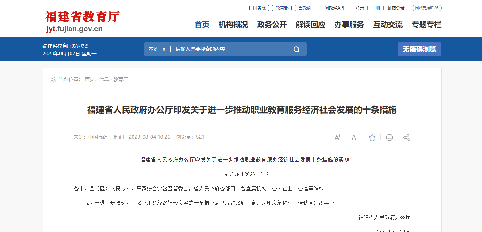 為深入學(xué)習(xí)貫徹黨的二十大精神和習(xí)近平總書(shū)記關(guān)于職業(yè)教育的重要指示精神,深入落實(shí)全國(guó)職業(yè)教育大會(huì)部署,根據(jù)中共中央辦公廳、國(guó)務(wù)院辦公廳印發(fā)《關(guān)于深化現(xiàn)代職業(yè)教育體系建設(shè)改革的意見(jiàn)》,按照聚焦全省高質(zhì)量發(fā)展現(xiàn)實(shí)需求,深化產(chǎn)教融合、校企合作,促進(jìn)教育鏈、人才鏈與產(chǎn)業(yè)鏈、創(chuàng)新鏈銜接的要求,結(jié)合我省經(jīng)濟(jì)社會(huì)發(fā)展對(duì)職業(yè)教育高質(zhì)量人才培養(yǎng)的迫切期盼,深入推進(jìn)福建特色現(xiàn)代職業(yè)教育體系建設(shè),提出以下十條措施。