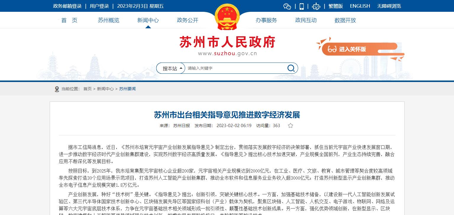 蘇州發(fā)布培育元宇宙產(chǎn)業(yè)創(chuàng)新發(fā)展指導意見:到2025年元宇宙相關產(chǎn)業(yè)規(guī)模達到2000億元