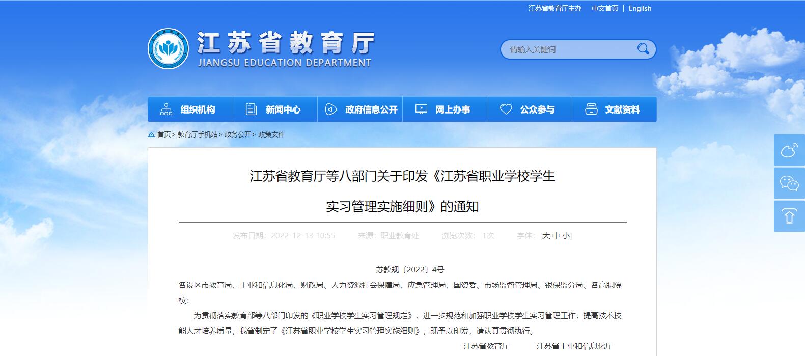 江蘇省教育廳等八部門日前聯(lián)合印發(fā)《江蘇省職業(yè)學(xué)校學(xué)生實(shí)習(xí)管理實(shí)施細(xì)則》
